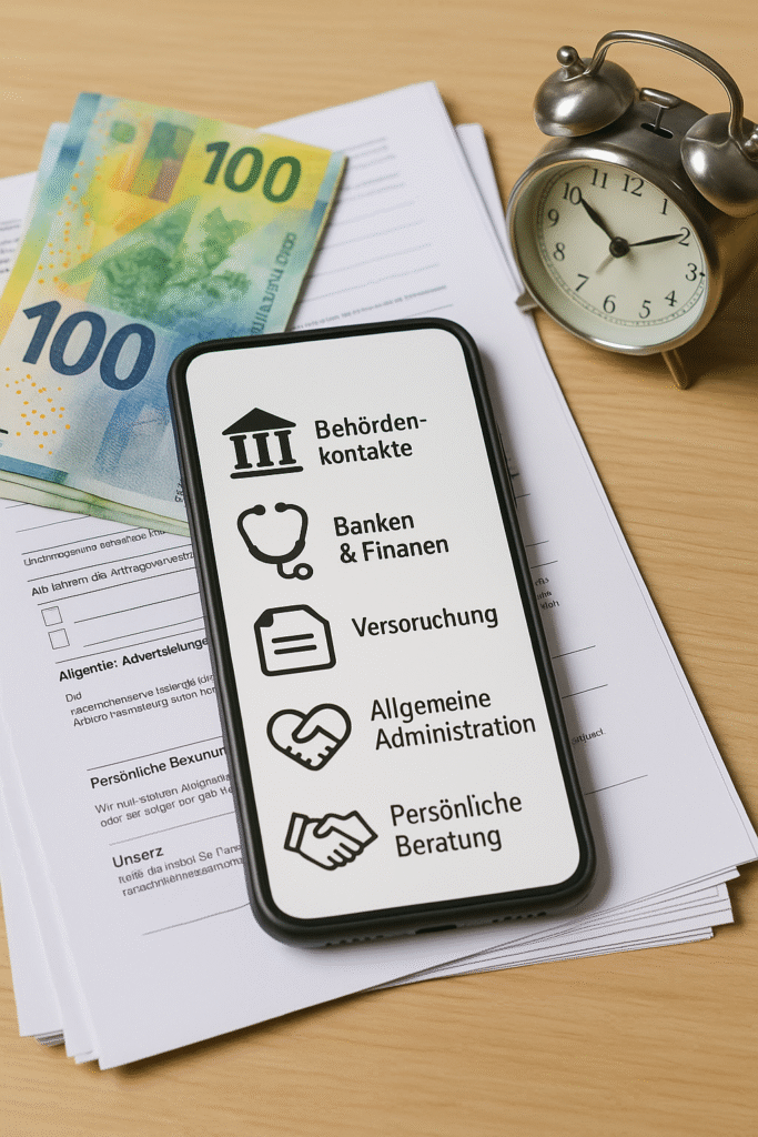 - Allgemeine Administration: Hilfe bei Verträgen, Formularen, Rechnungen oder Schriftverkehr.